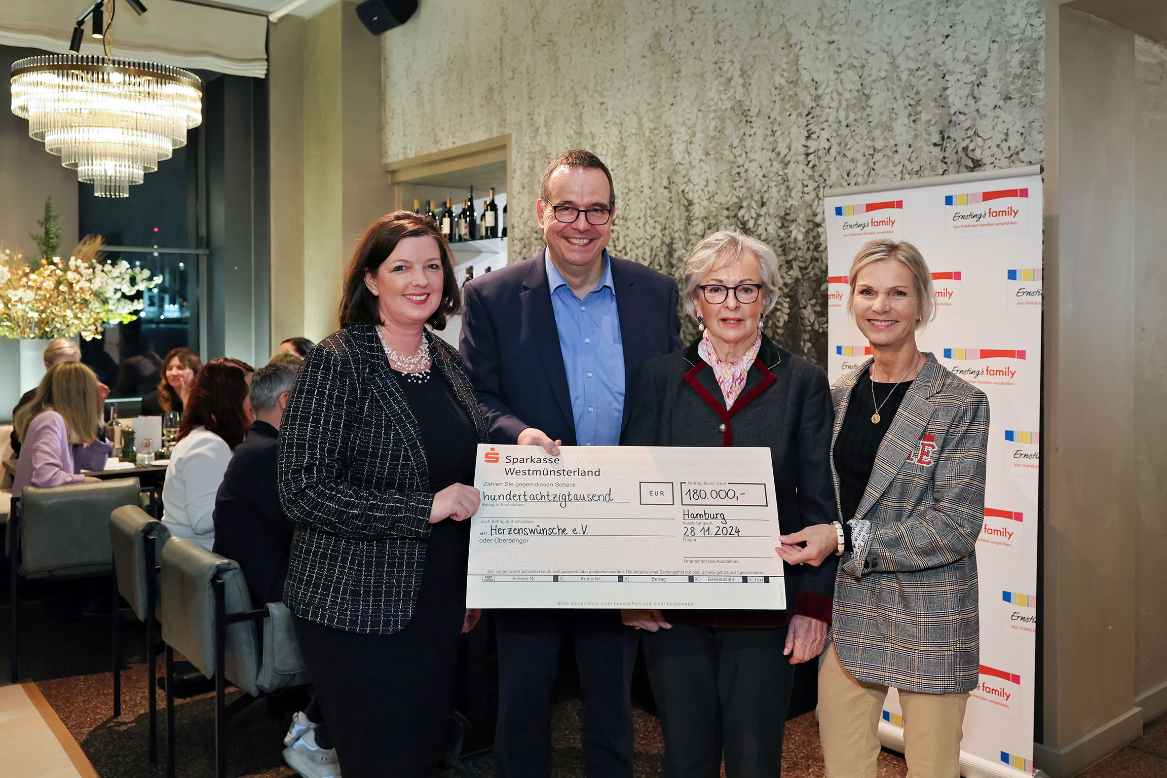 Rund 70 Gäste folgen am Donnerstag, den 28. November der Einladung des Modehändlers Ernsting’s family in Tim’s Restaurant in Hamburg zu seinem inzwischen traditionellen, jährlichen Fashion Dinner an der Elbe. Journalist*innen, Influencer*innen und weitere Geschäftspartner*innen lassen sich die Highlights der neuen Ernsting’s family Frühjahrskollektionen 2025 präsentieren. Der Abend startet aber mit einem anderen Highlight. Gleich zu Beginn der Veranstaltung überreicht die Ernsting’s family Gesellschafterin und Tochter des Gründerpaares Karin Ernsting dem karitativem Verein Herzenswünsche e. V. einen Spendenscheck in Höhe von 180.000 Euro. Gemeinsam setzen sich Ernsting’s family und Herzenswünsche e. V. seit mehr als 30 Jahren für schwerkranke Kinder und Jugendliche ein, indem sie ihre größten Wünsche wahr werden lassen.
